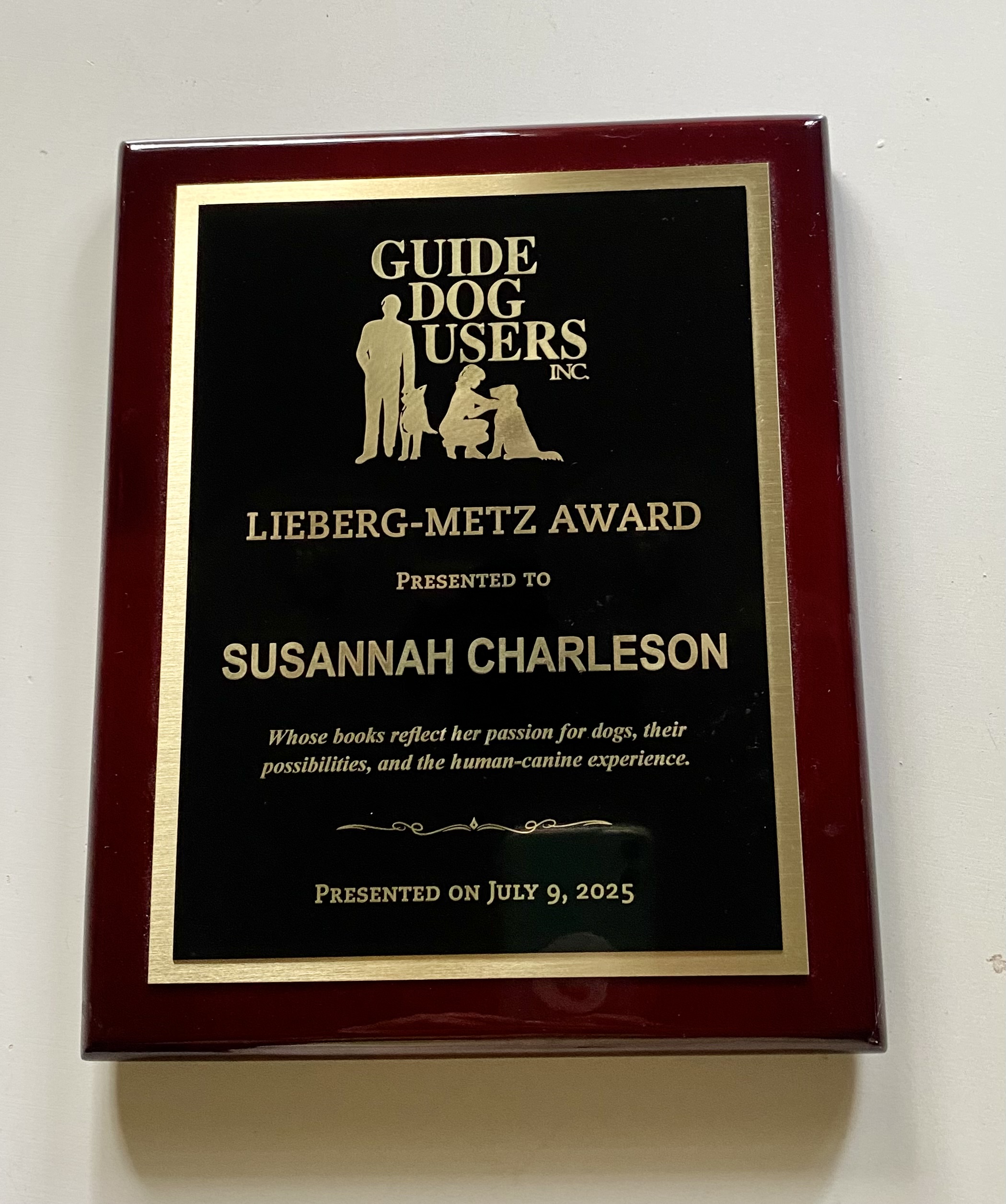 —–This summer, I was honored to be co-recipient of the Lieberg-Metz Award from Guide Dog Users, Inc., an affiliate of the American Council of the Blind and founding member of the Coalition of Assistance Dog Organizations (CADO). The award (shared this year) celebrates individuals who support and further the human canine partnership.